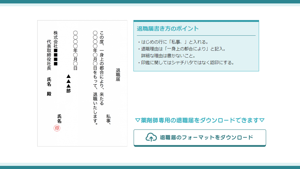 以下のページで、退職願の書き方や退職届との違いについて紹介しているほか、薬剤師専用の退職届フォーマットのダウンロードができます。活用してみてください。