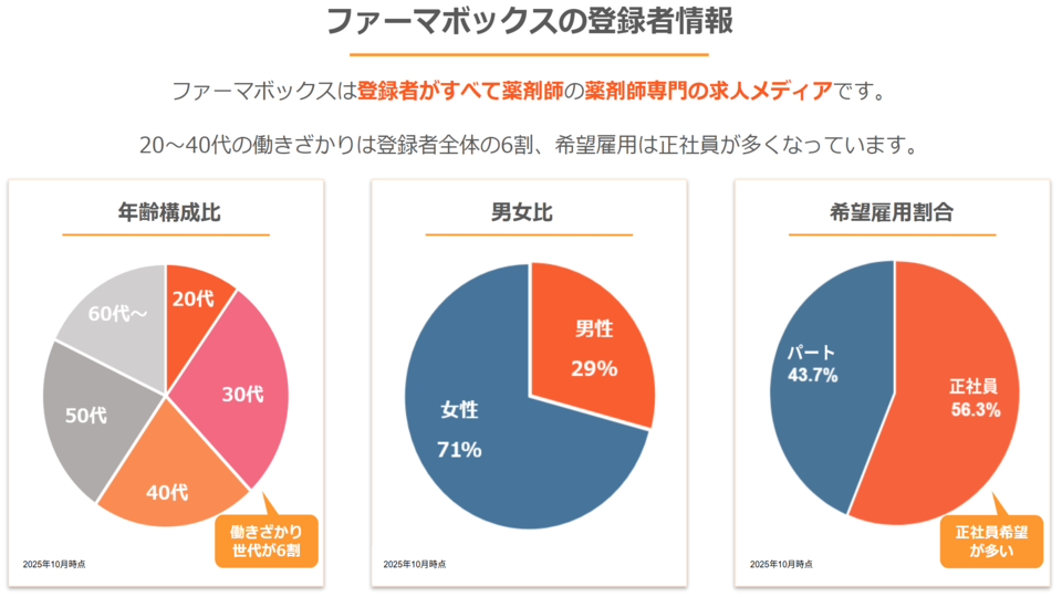 登録者はすべて薬剤師の、薬剤師専門の求人メディアです!20〜40代の働き盛りの薬剤師が6割以上を占めており、希望雇用形態は正社員が多くなっています。